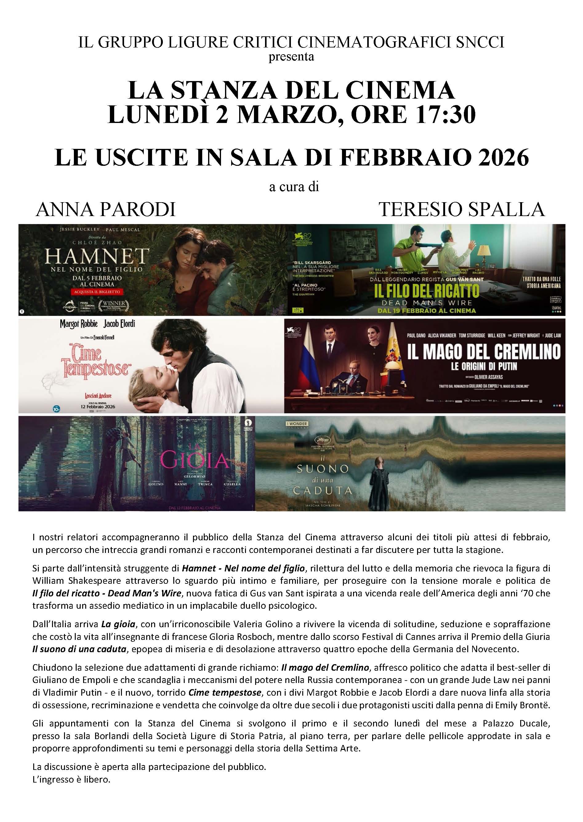 Gli appuntamenti con la Stanza del Cinema si svolgono il primo e il secondo lunedì del mese a Palazzo Ducale, presso la sala Borlandi della Società Ligure di Storia Patria, al piano terra, per parlare delle pellicole approdate in sala e proporre approfondimenti su temi e personaggi della storia della Settima Arte.